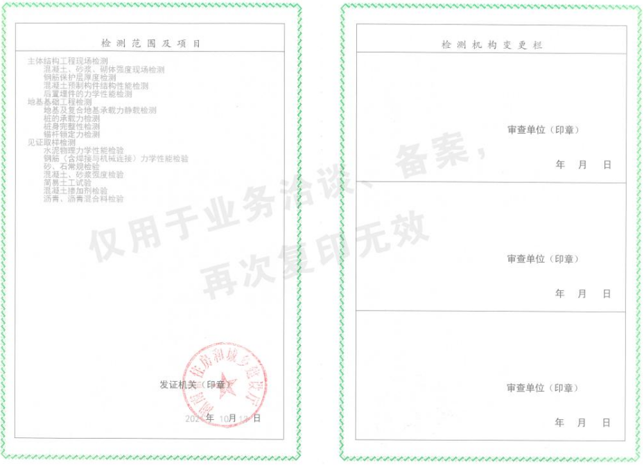 2021年10月公司獲批建設(shè)工程質(zhì)量檢測(cè)機(jī)構(gòu)資質(zhì)證書(shū)